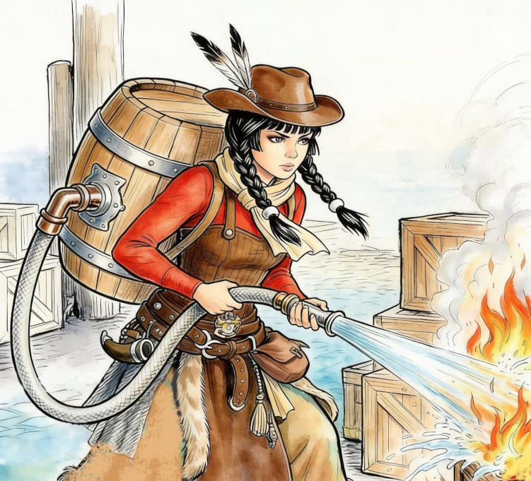 Mit ernstem Blick und hochkonzentriert, die Waldhüterin Bluemoon Sweetrain, bei ihrem verantwortungsvollem Tun, dem Löschen eines Brandes, der zu Übungszwecken im Hafen von Carima entfacht wurde.
